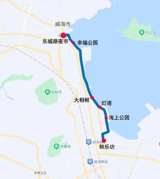 線路由東城路夜市發(fā)車,途經(jīng)大相框(市人社局東)、燈塔、海上公園(慶威花園)、韓樂坊東(經(jīng)區(qū)中國銀行)、韓樂坊(紅星美凱龍)、海上公園(慶威花園)、燈塔、大相框(市人社局東)、幸福公園后返回東城路夜市。