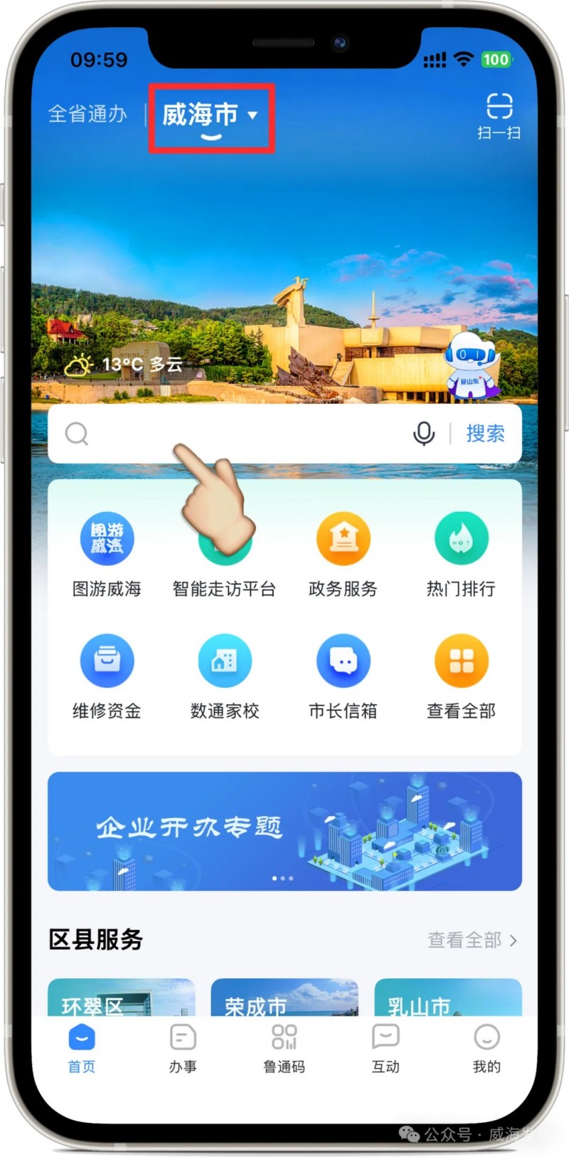 進(jìn)入“愛(ài)山東”APP后,在首頁(yè)左上角選擇進(jìn)入“威海市”,在搜索框搜索關(guān)鍵詞“銀行營(yíng)業(yè)網(wǎng)點(diǎn)”,點(diǎn)擊進(jìn)入應(yīng)用。